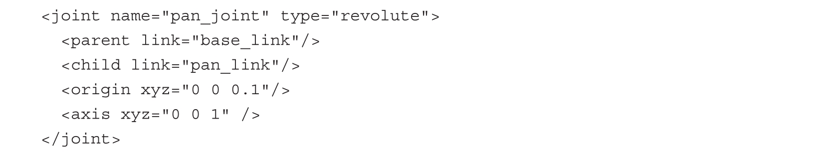 在前面的代码片段中,我们定义了一个具有唯一名称和关节类型的关节。这里我们使用的关节类型是旋转关节(revolute),父连杆和子连杆分别是base_link和pan_link。在此标签内还指定了关节原点。