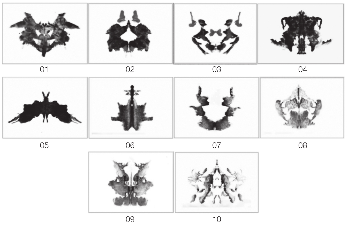 接下来,我们将进行一个简单的心理学测试。如图1—1所示,有10张不同形状和颜色的图片,编号分别为01~10。其中5张是黑白图片(01、04、05、06、07),墨迹深浅不一;2张是绿色为主的图片(02、03),加了红色斑点;3张是彩色图片(08、09、10)。可以发现,这10张图片都是对称图形,看上去像某种符号。