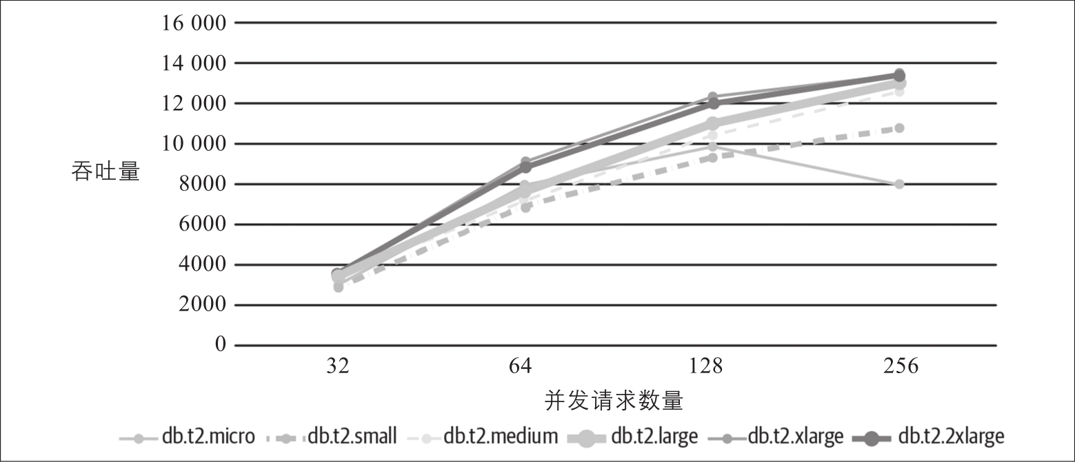 ●在请求负载增加到256之前,中间两个较弱的实例(db.t2.medium,db.t2.large)执行得相当好。这两个实例的吞吐量下降表明它们已经超载,如果请求负载增加,结果只会变得更糟糕。