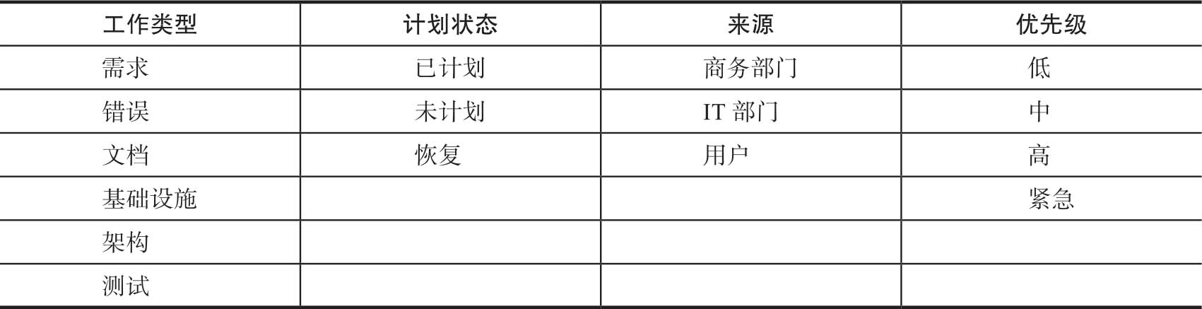 为了帮助企业进行优化,应该从一开始就正确地标记工作项。非计划工作可能起源于项目内部或外部。如果出现错误、技术问题或误解了需求,就可能需要返工。确保开发者可以通过正确的标签从一开始就分析工作。这不应该成为一个复杂的治理框架,而是只需选择一些标签,这些标签将有助于以后优化团队工作。表2-1展示了如何对工作项进行分类。