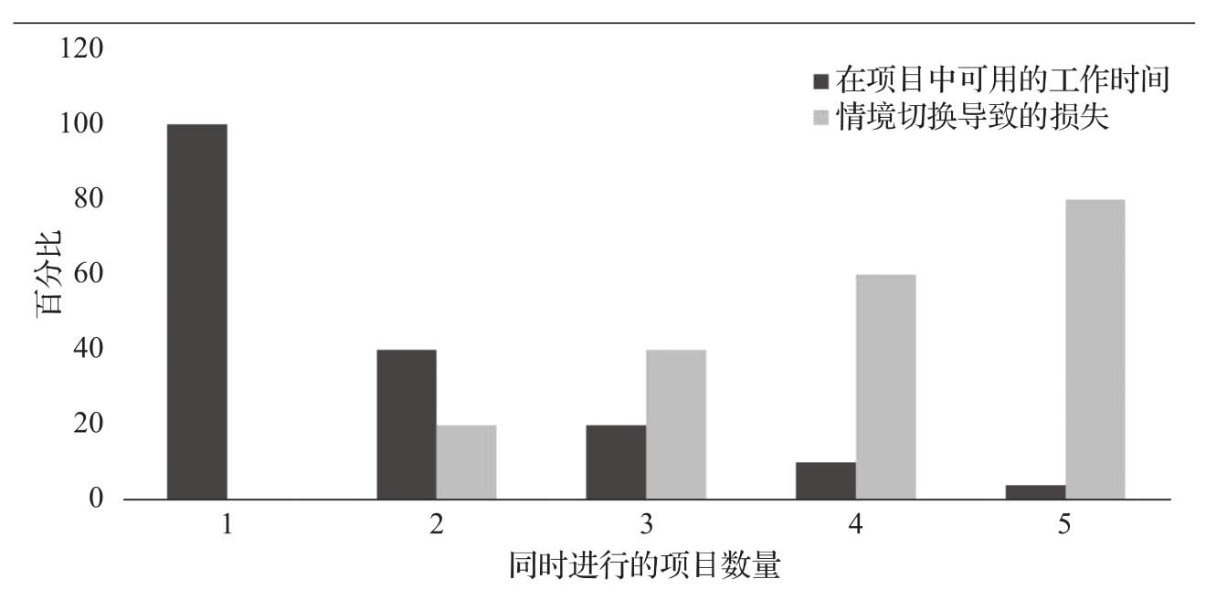 所有开发者都知道频繁的情境切换会降低生产力。如果开发者在编码时受到干扰,那么在恢复到相同的生产力水平时需要一些时间。因此,同时处理多个项目或任务也会降低生产力。杰拉尔德·韦恩伯格在《优质软件管理:系统思维》( Quality Software Management : Systems Thinking )中,提出了一项研究结果:仅同时在两个项目上工作时,效率下降约20%(Weinberg G.M.1991);每增加一个项目,效率会再下降20%(见图2-1):