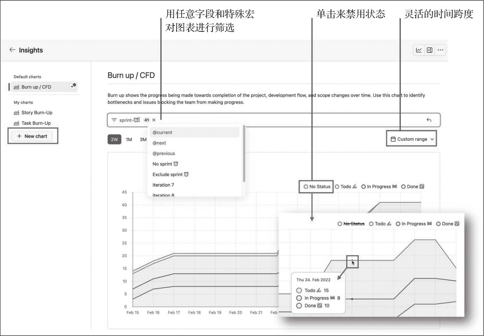 用户可以通过非常灵活的图表报告实时数据来了解进展情况。通过右上角的菜单可以访问洞察,或者从视图创建一个图表。还可以为图表使用预定义的时间范围,或选择自定义范围。也可以使用宏来筛选图表,例如迭代字段的@current或@next,或指派人字段的@me。用户可以通过单击它们来禁用图表中的状态,可以用鼠标悬停在日期上查看详细信息(见图2-21)。