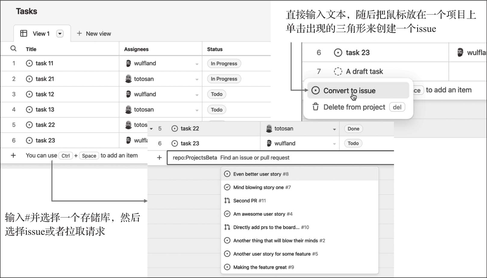 项目中的默认视图是表视图。它被优化用于输入数据。按Ctrl+空格键或单击表格的最后一行,可以直接输入新工作项的名称,然后将该项转换为issue。或者可以输入#并选择一个存储库,然后选择可用的issue或拉取请求(见图2-15)。