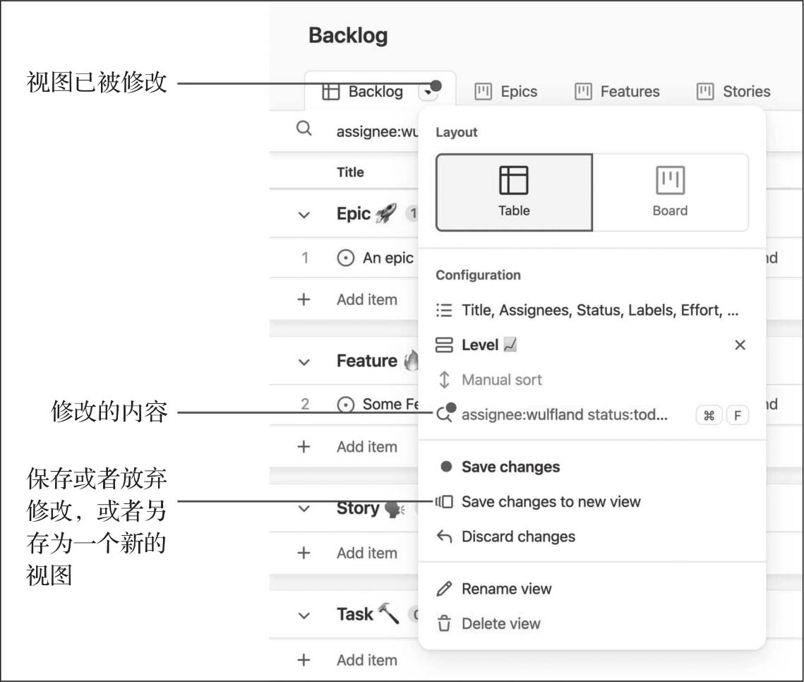 每次在视图中对数据进行排序、筛选或分组,或在表格和看板视图之间切换时,选项卡标题中的蓝色图标都会指示该视图有未保存的更改。用户可以在菜单中查看更改并保存或丢弃,也可以将它们保存为一个新的视图(见图2-19)。