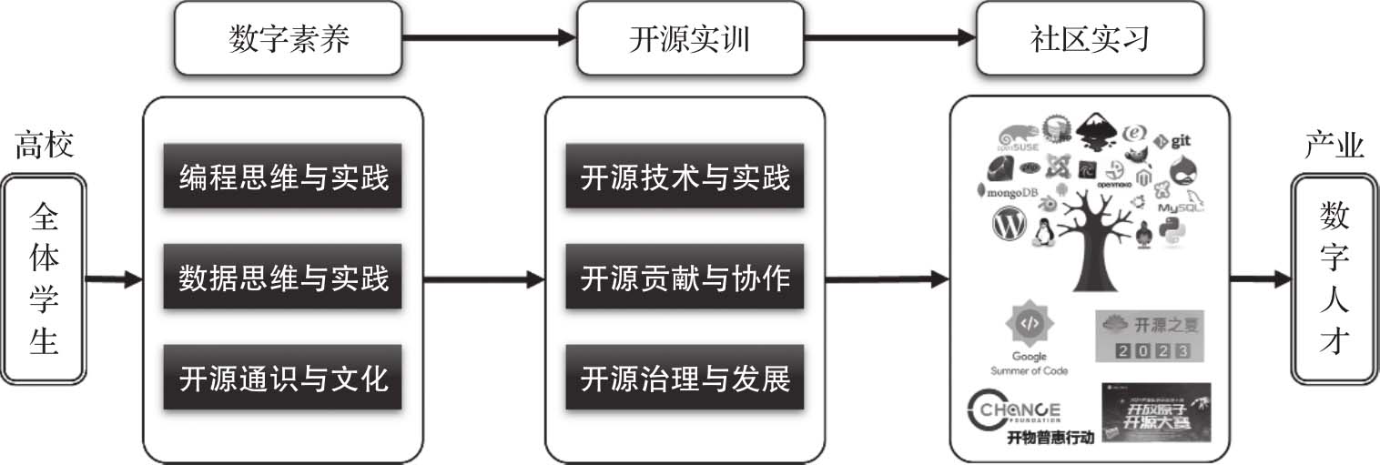 我们认为开源不应只成为专业教育,只放在计算机、信息类的学科下面,因为开源背后还有开源协作、开源精神,有很多思想方面的内容。我们希望未来开源教育可以发展成为全民教育,每一个数字时代的公民都应具备开源方面的知识和能力。不管你是否从事开发相关的工作,未来都需要用到开源相关的技能,例如一些内容翻译工作可以基于开源的数字化协作来完成。开源教育有两层含义:教人“用”开源,以及用“开源”教人。这些内容对于每个数字公民来说都是非常重要的。而我们也一直试图在高校构建这样一个完整的培养体系(见下图),这不仅仅是对现有教育体系的补充,更是一种变革,而本书的出版无疑是朝着这个方向又迈进了坚实的一步。
