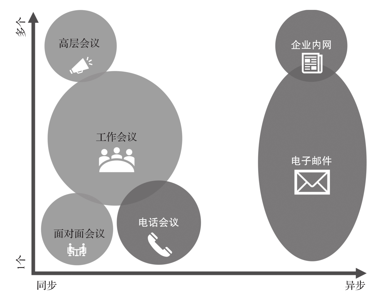 如果读者在一个传统企业工作,异步和同步工作的组合可能仍然像图4-2那样。至少在几年前是这样的。大部分工作是通过电子邮件或会议完成的,而会议通常是在同一个房间里进行的。