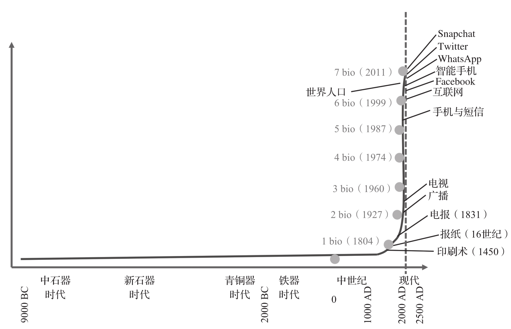 图4-1说明了世界人口的指数增长与人们的通信行为变化之间的关系。