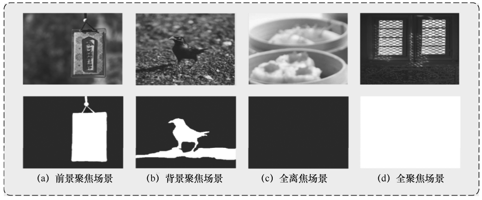 为明确图像非聚焦模糊处理的处理对象以便后续讨论,本节将介绍非聚焦模糊图像的定义及类别。在各类研究中,常将非聚焦模糊图像中的模糊区域称为离焦区域,清晰区域称为聚焦区域。并且,在各类非聚焦模糊检测方法的输出和非聚焦模糊检测训练数据集中,经常将聚焦区域标记为白色(值为1),非聚焦区域标记为黑色(值为0),最终形成一个分割出离焦区域和聚焦区域的二值图掩模,如图1.2.1的第二行所示。
