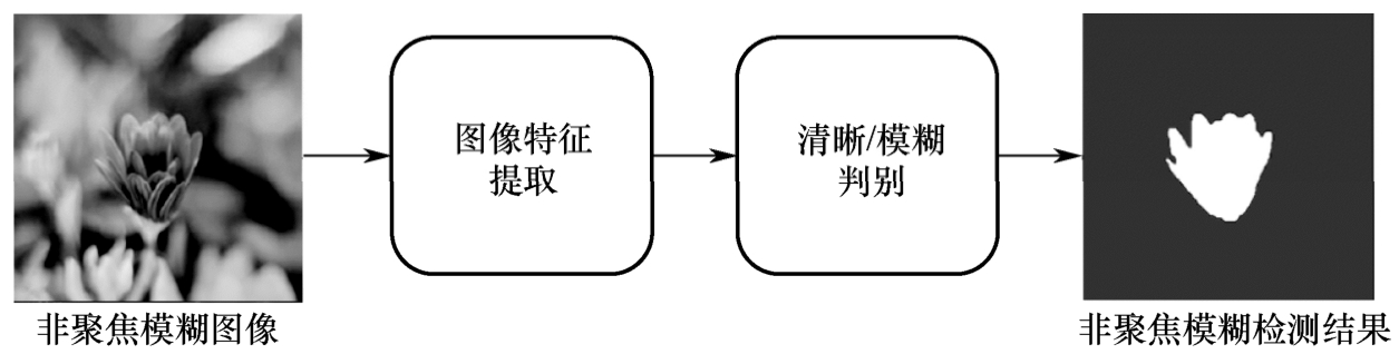非聚焦模糊检测的一般流程如图1.2.2所示。在一般性的方法中,非聚焦模糊检测都可以抽象凝练为:首先提取高度总结了输入图像关键信息的特征,其次设立相应的评判规则,最后根据所获取的特征判断图像的各部分是否为非聚焦模糊。在传统的非聚焦模糊检测中,特征提取常由手工设计的方法来完成,特征提取方法的设计主要依据频率、梯度等。同时,由特征判断图像是否模糊的判断规则,也基于所提取的特征的性质来人为裁定。而在基于深度学习的非聚焦模糊检测中,特征提取方法则由深度网络来完成,该部分的设计往往是整个流程的核心。后续基于网络提取的特征来判断是否模糊的工作,则交由全连接层等各类深度网络模块通过分类来完成。