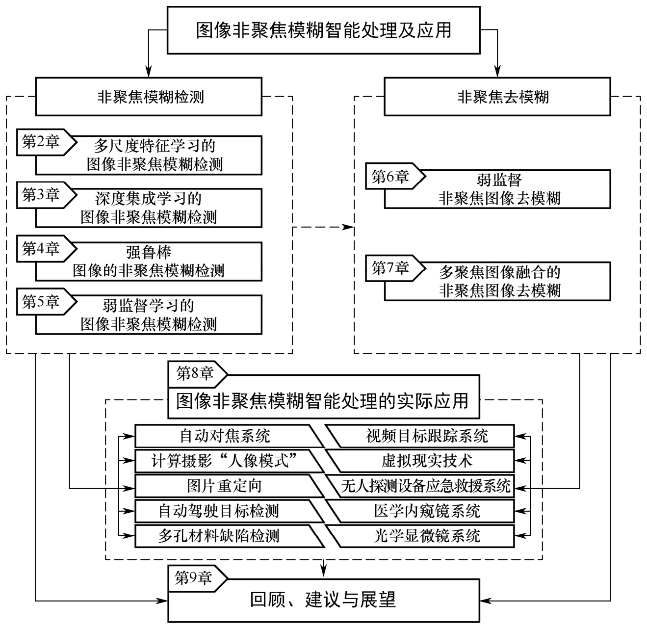 模糊作为最常见的图像退化方式之一,如何感知模糊、处理模糊注定是一个十分重要的课题,图像非聚焦模糊处理技术应运而生。在不断的发展进步中,图像非聚焦模糊处理的性能越发强大,也越发在各类大小应用场合中发挥着重要作用。本书总结了多年来图像非聚焦模糊处理技术的研究和该领域的最新进展情况,介绍了几大类图像的非聚焦模糊处理方案及其应用,以期为读者树立对非聚焦模糊处理的全面认识,并作为进一步理论研究和实际应用的基础。本书总体安排及各章节内容如下。全书结构框图如图1.5.1所示。
