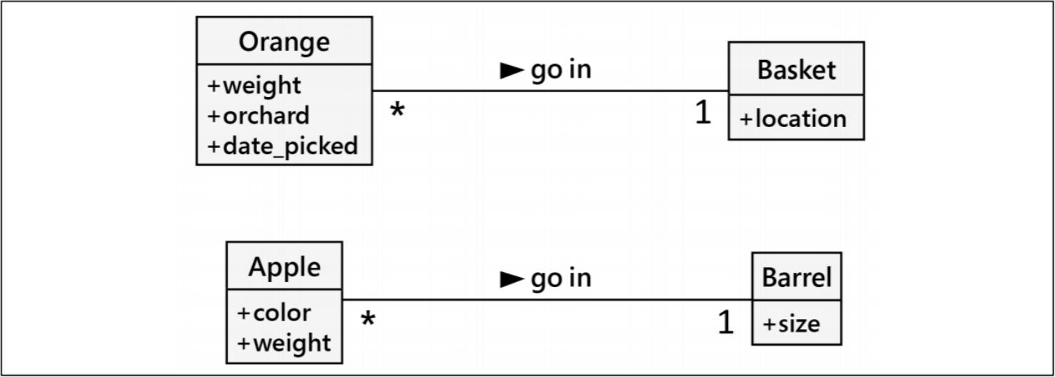 通常,在设计阶段,我们不需要过度担心数据类型的问题,因为具体的实现细节是在编程阶段确定的。通用的类型名称在设计阶段就够用了,这就是为什么在图1.4中用date表示采摘日期,在实际的Python编程中使用datetime.datetime。如果在设计中需要用到列表类型,Java程序员可以选择LinkedList或ArrayList来实现,而Python程序员(也就是我们)可以选择list类型来实现,通过List[Apple]做类型提示。
