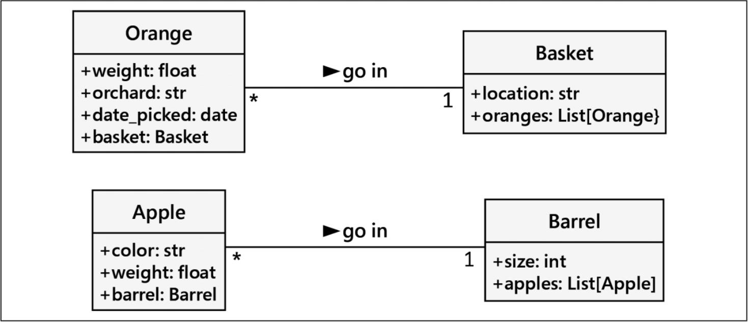 到目前为止,在水果库存的示例中,所有的属性都是基本类型的。然而,有一些隐含的属性,我们可以通过关联关系显式说明。对于一个给定的橘子,我们可以用一个basket属性来表示这个橘子所在的篮子,这个属性的类型提示是Basket。