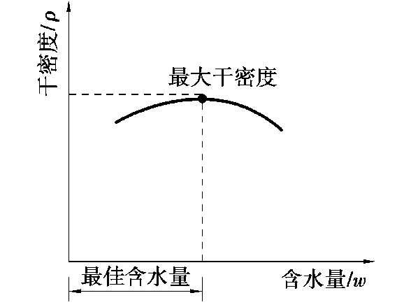 在同一压实实功条件下,填土的含水量对压实质量有直接影响。较为干燥的土,由于颗粒之间的摩阻力较大,因而不易压实。当含水量超过一定限度时,土颗粒之间孔隙由水填充而呈饱和状态,也不能压实。当土的含水量适当时,水起润滑作用,土颗粒之间的摩阻力减少,压实效果好。每种土都有最佳含水量。土在这种含水量条件下,使用同样的压实功进行压实,所得到的密度最大,如图1.67 所示。不同的土有不同的最佳含水量,如砂土为 8%~12%、黏土为 19%~23%、粉质黏土为 12%~15%、粉土为 15%~22%。简单检验黏性土含水量的方法一般是以“手握成团,落地开花”为宜。