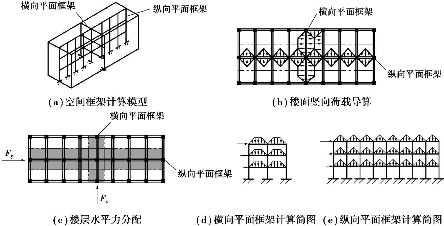 在以上两点假定的基础上,可按下述方法将空间框架结构简化为二维平面框架结构进行内力、变形计算以及结构设计。首先,将楼面竖向荷载导算至相邻梁上,如图2.2(b)所示;其次,将作用于整个结构的楼层水平力分配给每一榀平面框架[如图2.2(c)所示,其中为了简化计算可暂忽略扭转的影响]。由此得到的平面框架计算简图如图2.2(d)和图2.2(e)所示,横向框架和纵向框架均分别承受各自分配到的竖向力、水平力。其中,作用在节点的竖向集中力是由正交方向的框架梁传给柱的,一般是考虑框架梁承担的竖向荷载,并按简支梁计算其支反力后确定该节点竖向集中力[图2.2(d)和图2.2(e)中已省略];水平荷载(地震作用、风荷载)均需简化为节点集中力。上述计算的详细过程可参见本章附2.16的框架设计实例。