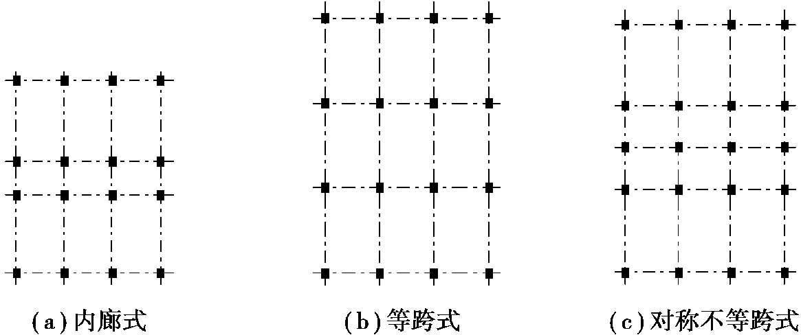 民用建筑种类多、功能要求复杂,柱网尺寸及层高难以统一,一般以300mm为模数。在住宅、旅馆、办公楼、教学楼等民用建筑中,为了减少框架柱对建筑功能的影响,柱网布置应注意与建筑隔墙布置相互协调,可尽量将柱布置在纵横建筑隔墙交叉点上,使主要建筑隔墙位于框架梁上。同时,柱网尺寸以6.0~9.0m为主,且框架梁的跨度不宜剧烈变化。