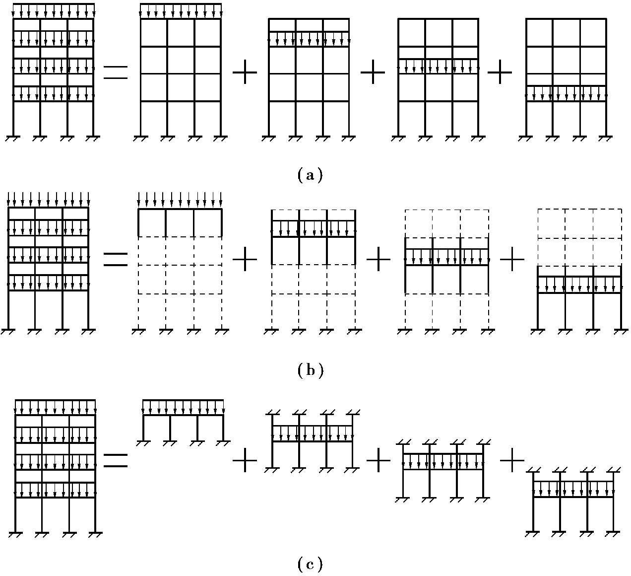 如图2.19(a)所示,竖向荷载作用下的多层框架可以分解为各层竖向荷载单独作用时框架内力的叠加,对于弹性小变形计算,叠加原理成立,这一分解过程是准确的。