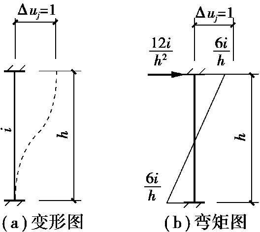 当Δ u j =1(单位水平位移)时,柱的变形如图2.21(a)所示。由结构力学的杆件转角位移方程可知,该柱上、下端的弯矩均为6 i / h [图2.21(b)],故该柱的剪力为: