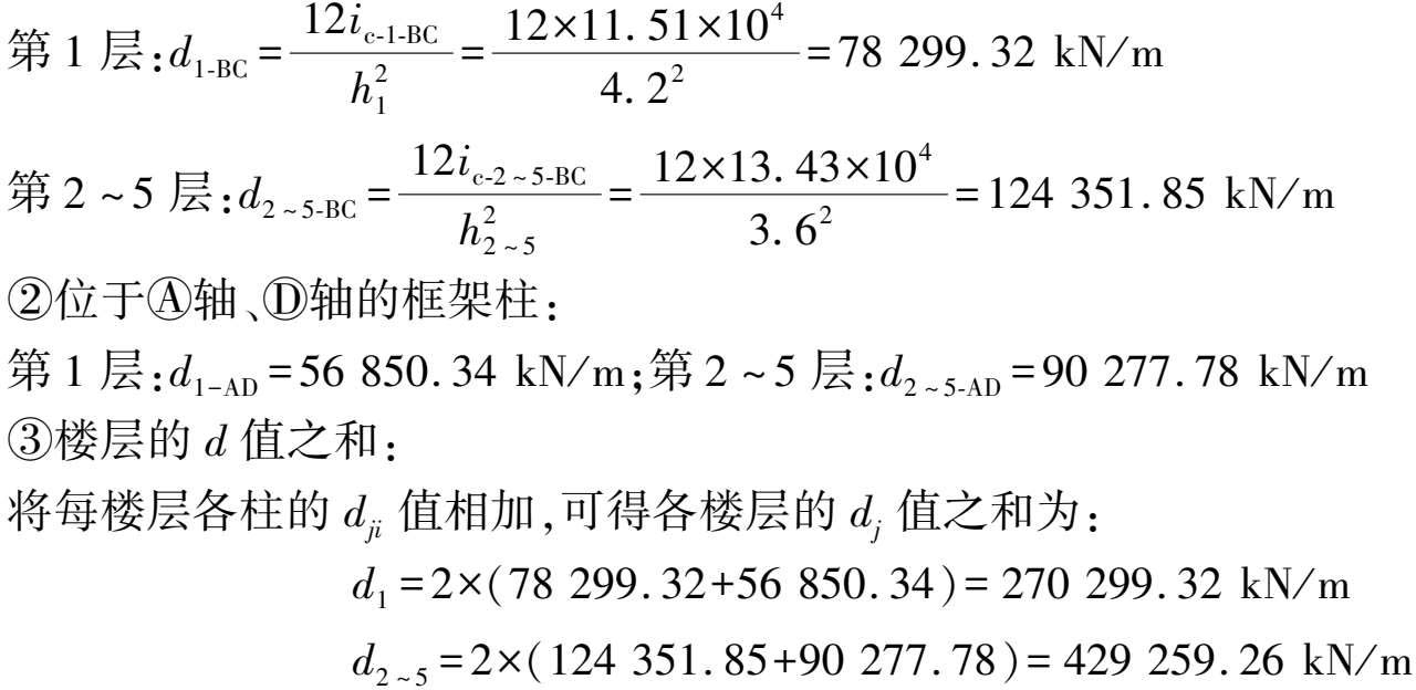 首先,计算各柱的抗侧刚度 d 值。该平面框架的2根中柱、2根边柱的 d 值均分别相同。