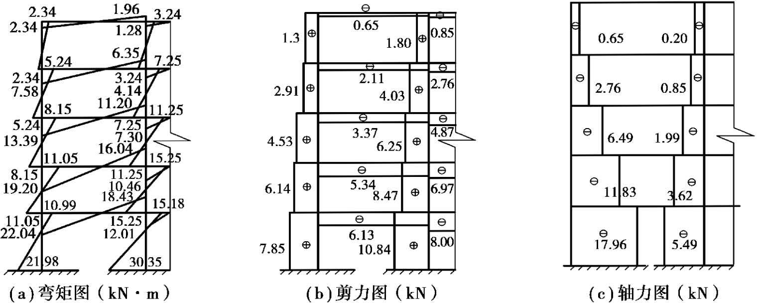综合以上结果,可绘制左风作用下框架的弯矩图、剪力图和轴力图(图2.24)。