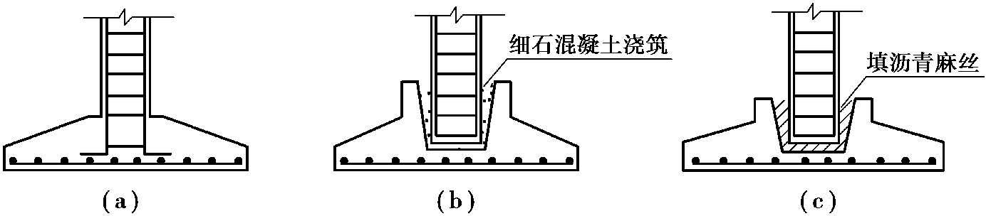 多层现浇框架中,框架柱与基础常采用刚接连接方式,如图2.18(a)所示(以柱下独立基础为例)。预制柱与基础的连接可采用刚接方式[图2.18(b)]或铰接方式[图2.18(c)],柱底部的约束条件则相应简化为固定支座、铰接支座。
