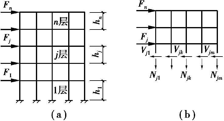 式(2.7)和式(2.8)表明:规则框架结构中,同一楼层各柱剪力按各柱的抗侧刚度 d jk 之比对楼层剪力 V F j 进行分配;考虑到同一楼层柱的高度一般相同,因此同层各柱剪力可按各柱的线刚度 i jk 之比进行分配。