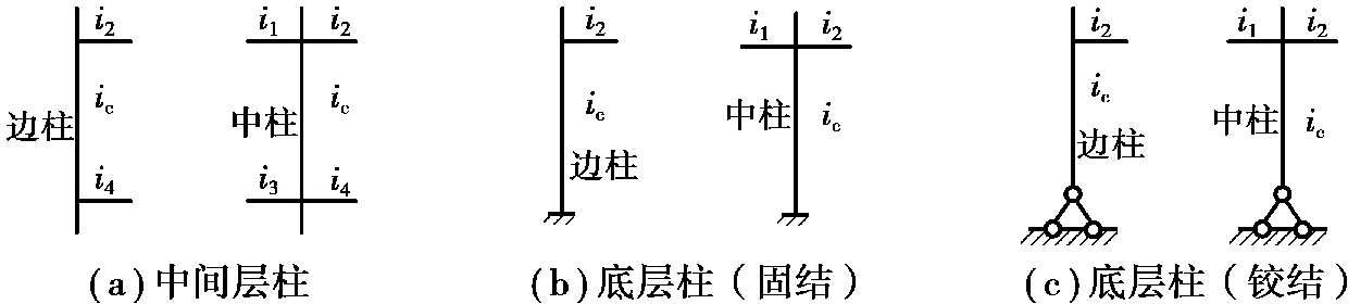 对于图2.26的各种类型的边柱,在计算 K 时,对于不存在的梁,该梁的线刚度取零。由以上给出的 K 和 α c 的计算式可知,当框架梁的线刚度无穷大时, K →∞ , α c →1;当 α c =1时,式(2.11)即为反弯点法的柱抗侧刚度表达式。