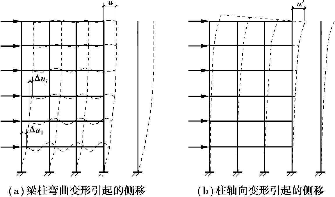 在水平荷载作用下,框架结构的侧向变形由两部分组成:由梁柱弯曲变形引起的变形(总体剪切变形)、由柱轴向变形引起的变形(总体弯曲变形),如图2.27所示。
