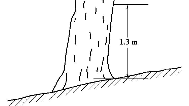 在我国,胸高位置在平地距地面 1.3 m处,在坡地以坡上方距地面 1.3 m(图1.10)。如果胸高处出现节疤、凹凸或其他不正常情况时,可在胸高断面上下距离相等干形较正常处,分别测定两个直径,取平均数作为胸径值。胸高以下分叉的树,可当作分开的两株树分别测定每株树的胸径,胸高断面不圆的树干相互垂直方向的胸径取其平均数。