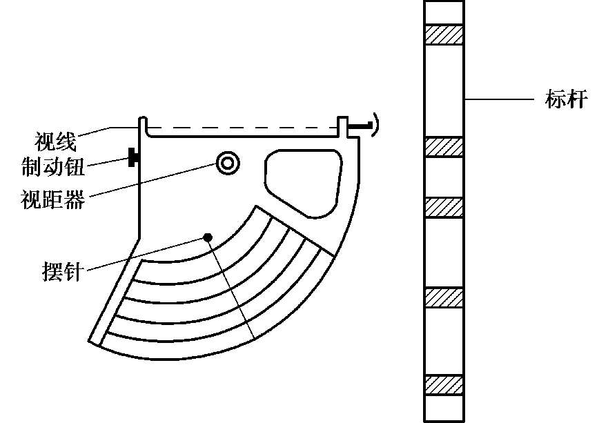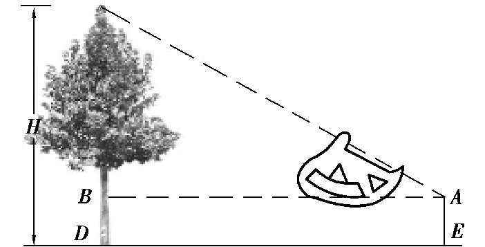 第三步:测高时,按动仪器背面制动按钮,让指针自由摆动。用瞄准器对准树梢后,即按下制动钮,使指针处于固定状态。在读盘上读出对应于所选水平距离的指针树高值,再加上观测者眼高 AE 即为树高 H (图1.8)。