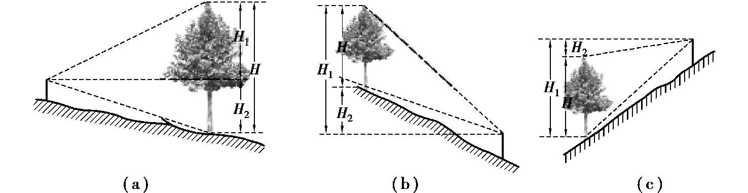在坡地上测定树高时,要先按照前述方法观测者眼高到树梢的高度,求得 H 1 ,再测观测者眼高到树干基部的高度,求得 H 2 ,仰视为正,俯视为负。若两次观测符号相反,则树木全高 H = H 1 + H 2 [图1.9(a)];若两次观测值符号相同,则 H = H 1 - H 2 [图1.9(b)、(c)]。