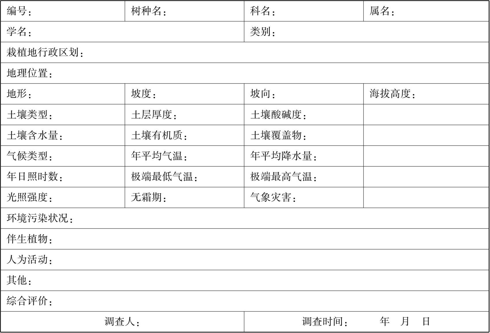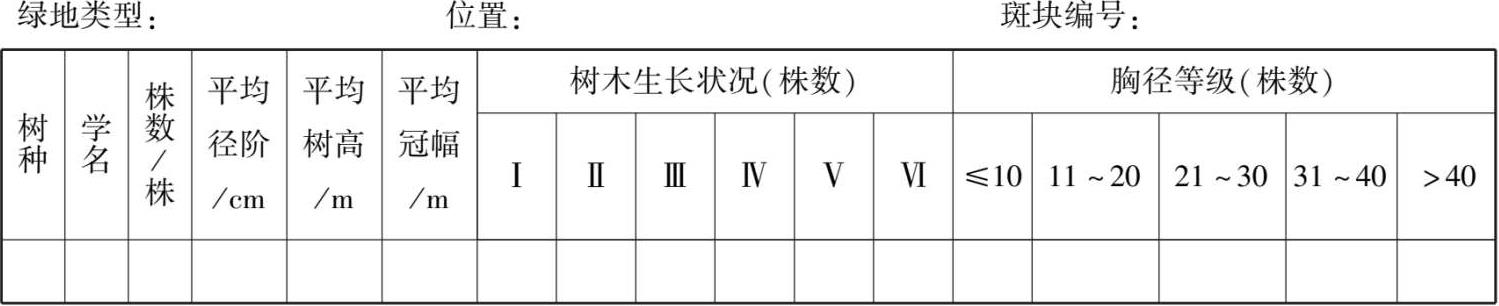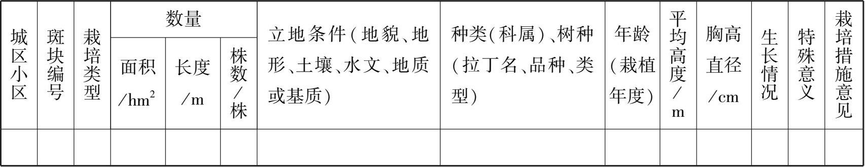 绿化植物调查表是反映不同类型绿化植物各项调查因子的表格,可按城市的行政分区和小区,分不同栽培类型归类并装订成册,称为簿册式绿化植物调查表,表头样式见表1.2。绿化植物调查表也可以是卡片的形式和计算机数据库档案的形式,目前在计算机已十分普及的情况下,应采用数据库管理的形式。