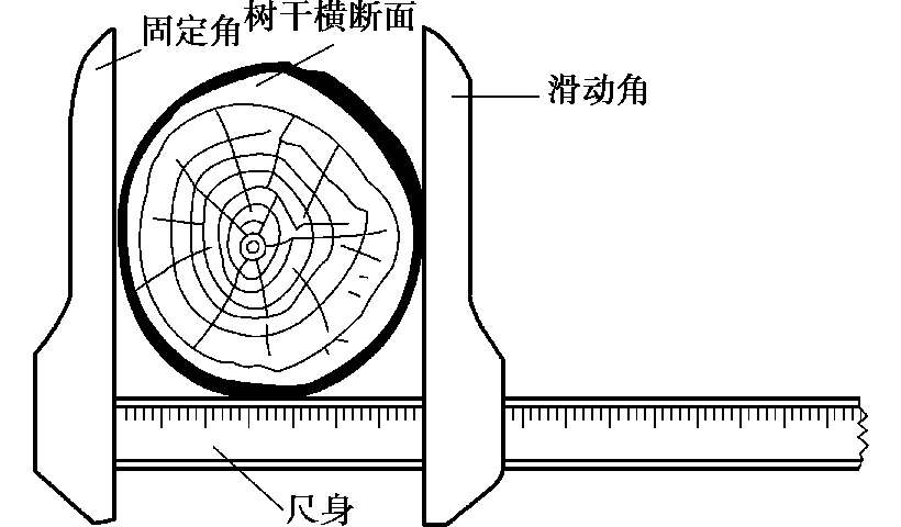 ①测径时使尺身与两脚所构成的平面与树干垂直,且尺身和两脚同时与所测树木断面接触。
