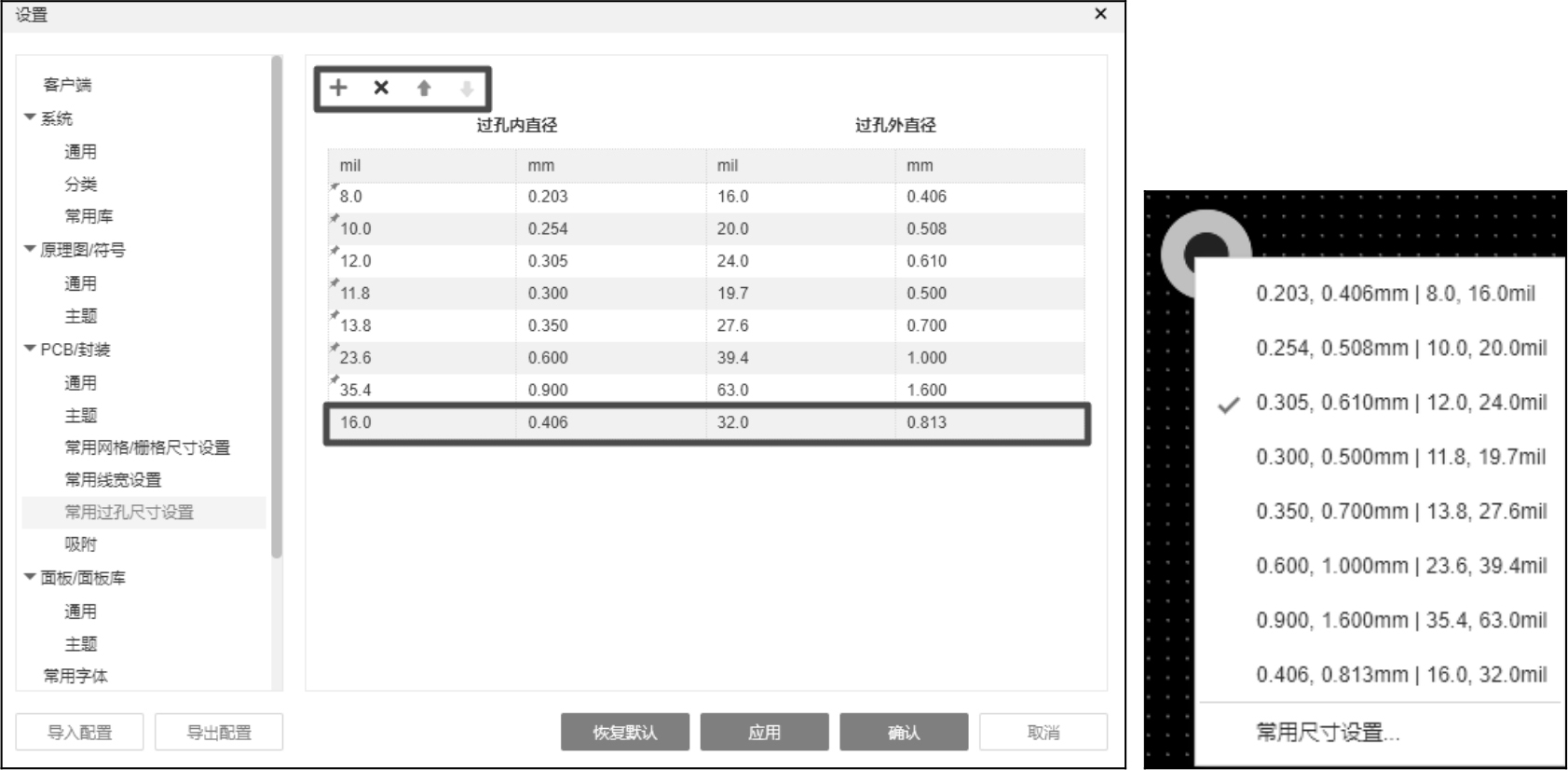 在进行PCB设计时经常需要使用不同类型的过孔,在系统通用参数设置对话框中单击“PCB/封装—常用过孔尺寸设置”,出现如图1-37所示的界面。在此界面中可以设置常用的过孔尺寸来方便设计。设置方法与设置栅格尺寸的方法一致。在PCB界面的走线命令下按Shift+V键即可切换设置的线宽。
