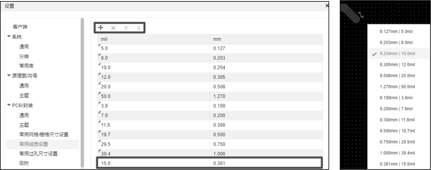 在进行PCB布线时经常需要切换线宽,在系统通用参数设置对话框中单击“PCB/封装—常用线宽设置”,出现如图1-36所示的界面,在此界面中可以设置常用的线宽来方便设计。设置方法与设置栅格尺寸的方法一致。在PCB界面中执行走线命令,按Shift+W键即可切换设置的线宽。