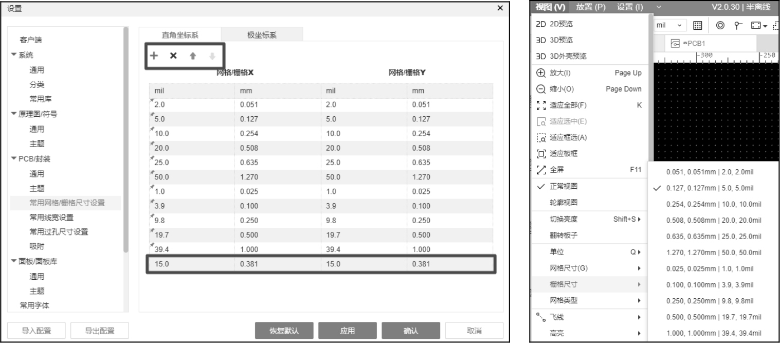 (2)Alt栅格尺寸:Alt吸附尺寸(在绘制过程中按Alt键吸附应用该参数)。推荐设置栅格 X 和 Y 都为5mil。