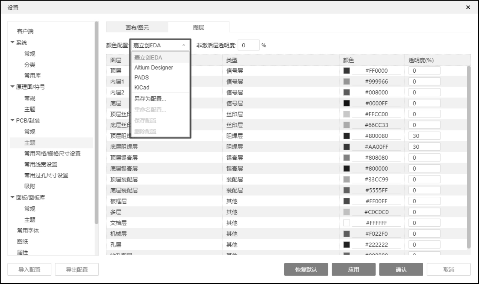 用户可根据个人喜好设置PCB界面的图层颜色和透明度,也可以选择其他PCB软件的主题。在系统通用参数设置对话框中单击“PCB/封装—主题”,如出现如图1-34所示的界面,在其中可进行其他PCB软件主题切换。
