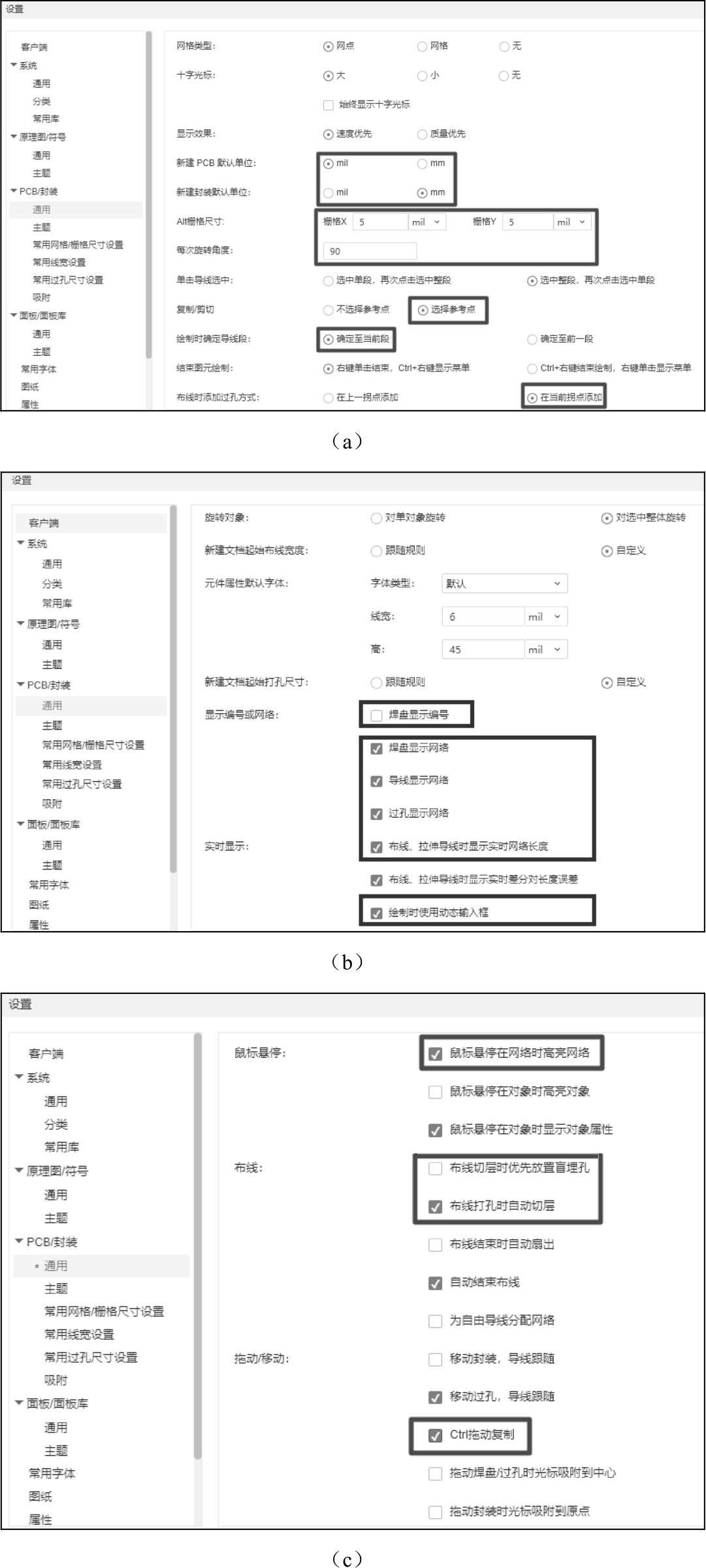 PCB通用设置包含嘉立创EDA专业版PCB和封装的一些常规设置。在系统通用参数设置对话框中单击“PCB/封装—通用”,出现如图1-31所示的界面。为了使读者充分了解常见设置的作用,在此对常见设置进行说明。(对重要参数推荐按照图1-31中的参数进行设置,其他保持默认即可。)