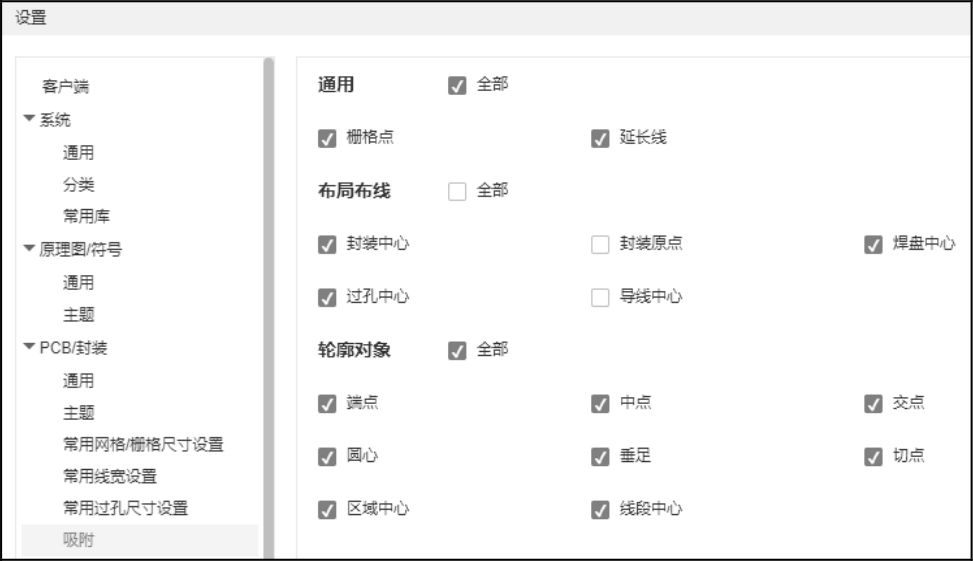 在系统通用参数设置对话框中单击“PCB/封装—吸附”,出现如图1-38所示的界面。吸附功能可以吸附焊盘的中心、过孔中心和线条的中心点等。对应的参数设置根据具体设计进行勾选。可以通过按ALT+S键或单击“顶部菜单—编辑—吸附”及在右键菜单中单击“吸附”来开启和关闭吸附功能。