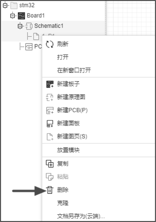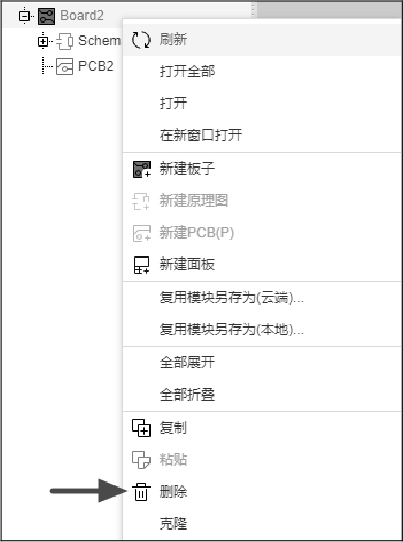 在工程中选中需要删除的板子文件,右击,在弹出的快捷菜单中选择“删除”选项即可删除该板子,如图2-16所示。