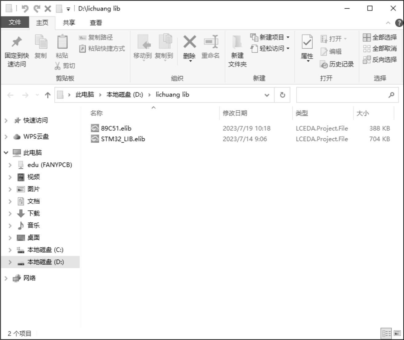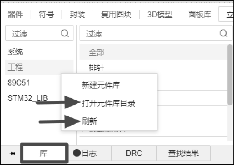 设计时经常需要调用已存在的元件库(公司或个人总结统一的库),只需将后缀为“.elib”的库文件放入客户端设置的库路径下,然后选择“刷新”选项,如图2-9所示,即可在底部面板中的“库”选项卡里进行调用。