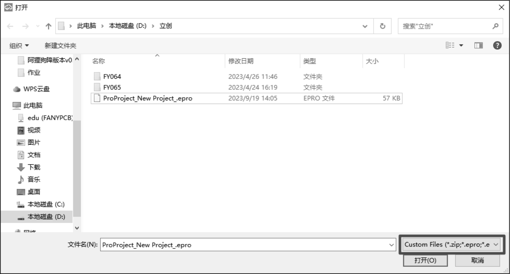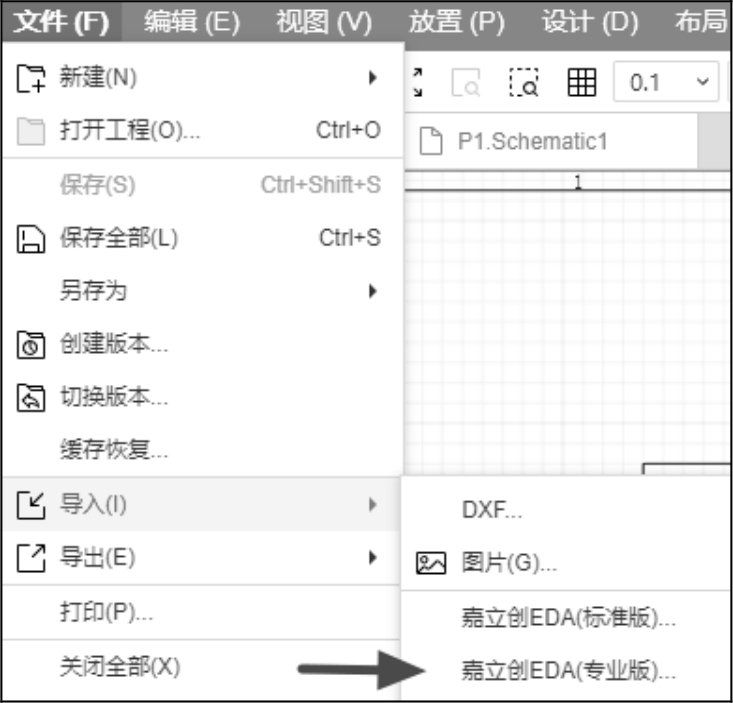 在全在线模式下,可以单击“文件—导入—嘉立创EDA(专业版)”,如图2-6所示,此时会出现如图2-7所示的窗口,选择对应工程文件(.epro后缀)后单击“打开”按钮,即可打开已存在的工程文件。