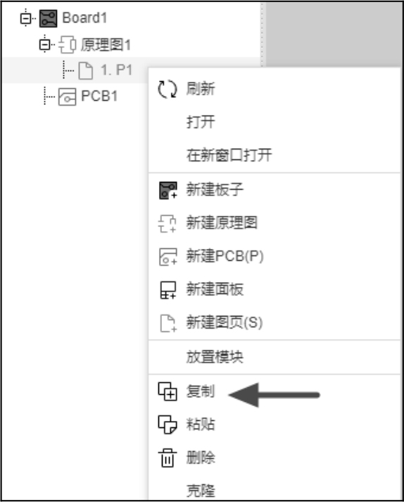 (1)打开已存在原理图图页设计所在的工程,选中对应图页,右击,在弹出的快捷菜单中选择“复制”选项,如图2-12所示。