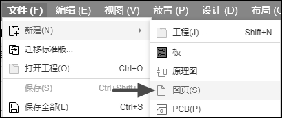 单击“文件—新建—图页”,如图2-11所示,可在工程中创建一页新的原理图图页。