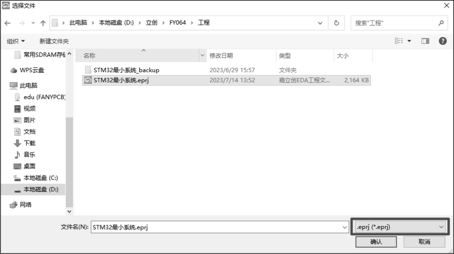 ,出现如图2-5所示的窗口,在选择对应工程文件(.eprj后缀)后,单击“确认”按钮即可打开已存在的工程文件。