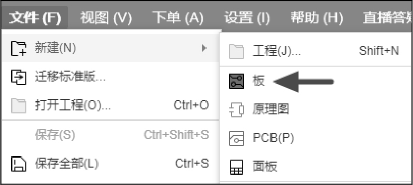 单击“文件—新建—板”,如图2-15所示,即可在工程中创建一个新的Board文件,新建的Board文件下面会默认创建一个原理图文件和一个PCB文件,用户无须再手动创建。