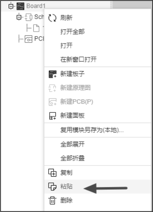 (2)然后打开需要添加此图页的工程,选中“Board1”右击,在弹出的快捷菜单中选择“粘贴”选项,如图2-13所示,即可添加上述(1)中所存在的原理图图页。
