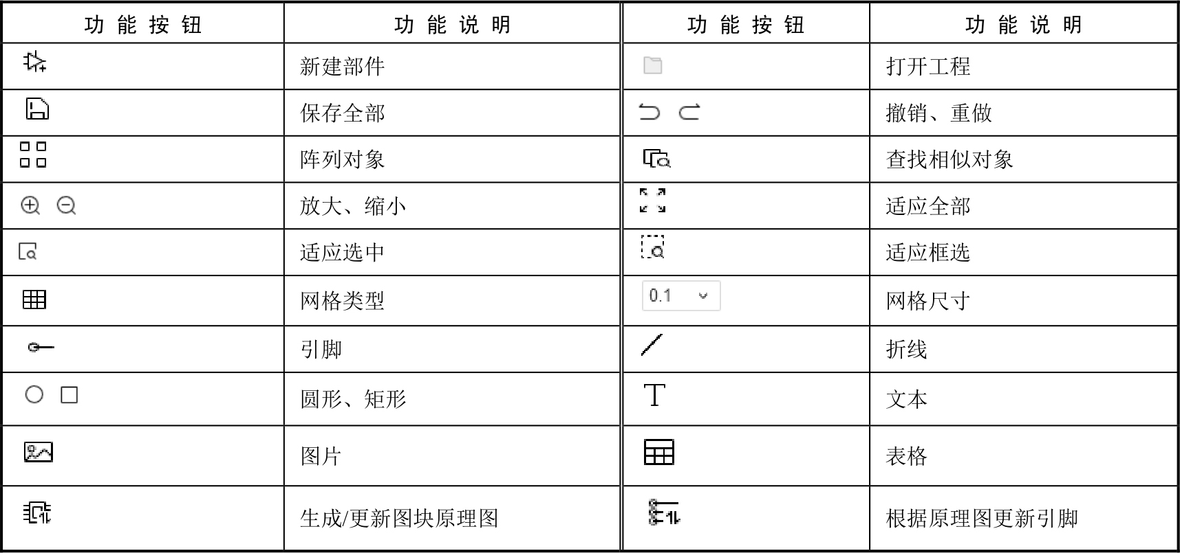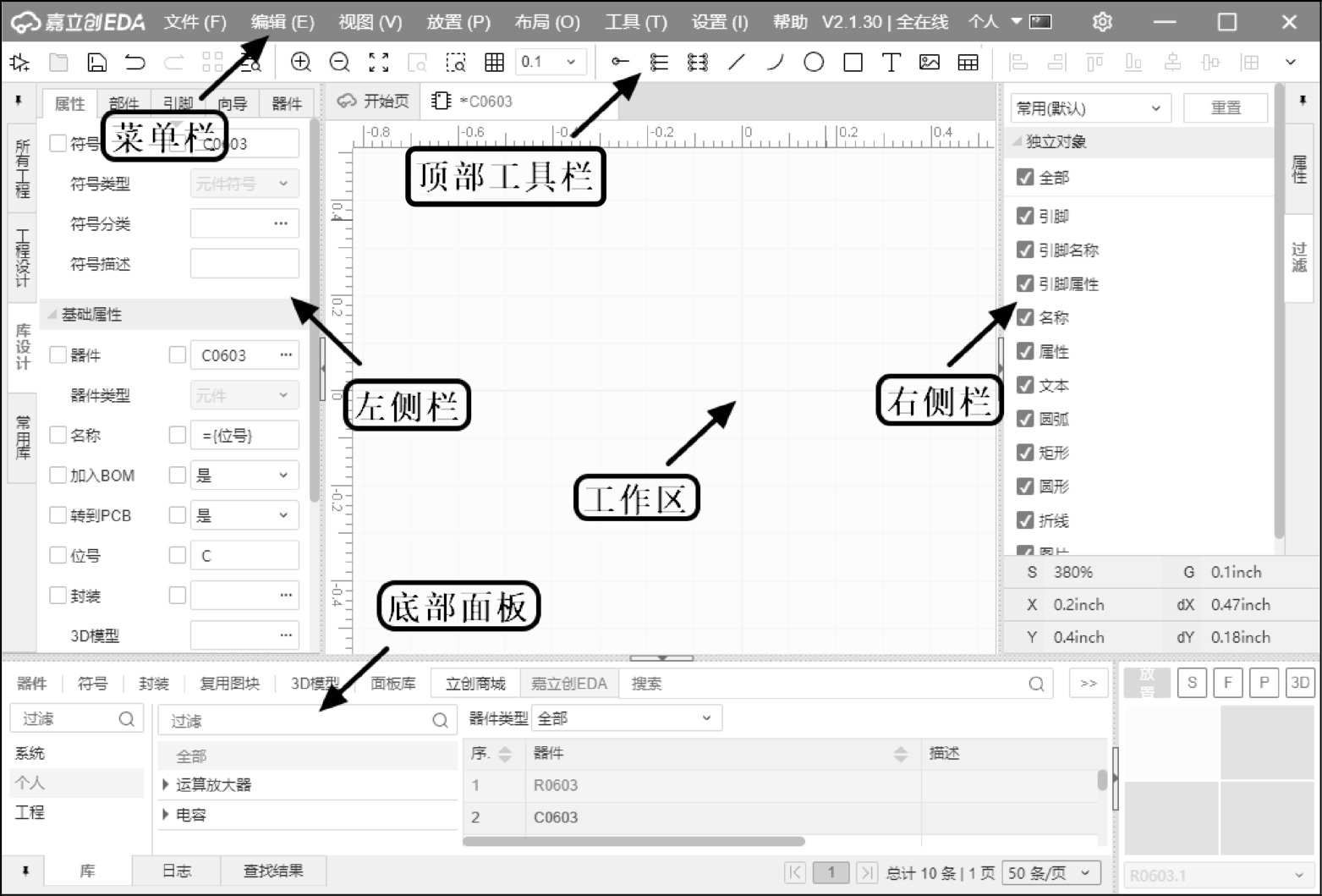 元件库设计是电子设计中首先要进行的步骤,通过元件库编辑器放置矩形、画线、放置引脚等编辑操作创建出需要的元件模型。元件库编辑器界面如图3-2所示。这里对元件库编辑器界面进行初步介绍。嘉立创EDA专业版元件库编辑器提供了丰富的菜单及绘制工具,整个界面可分为若干个工具栏和面板。