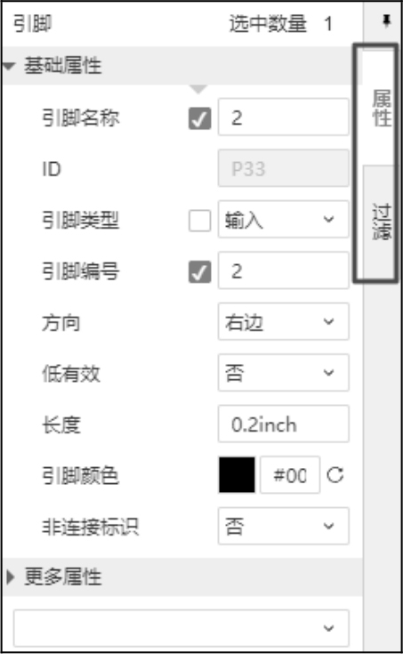 (1)属性:需要选中一个对象才能打开,如选引脚后可以设置引脚名称、引脚类型、长度等。