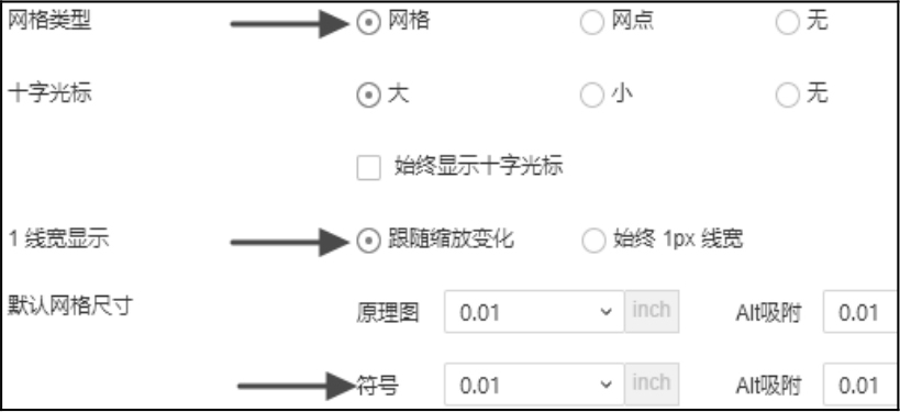 (1)网格类型:设置原理图/符号编辑界面的可视网格类型,包括网格、网点和隐藏网格,推荐选择“网格”类型,以便使引脚对齐。