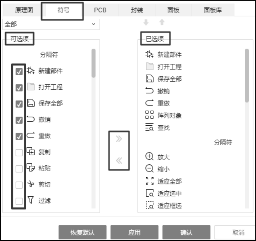 图标可用于将功能按钮移除或添加到“已选项”中,如图3-3所示。表3-1所示为顶部工具栏中的主要功能按钮。